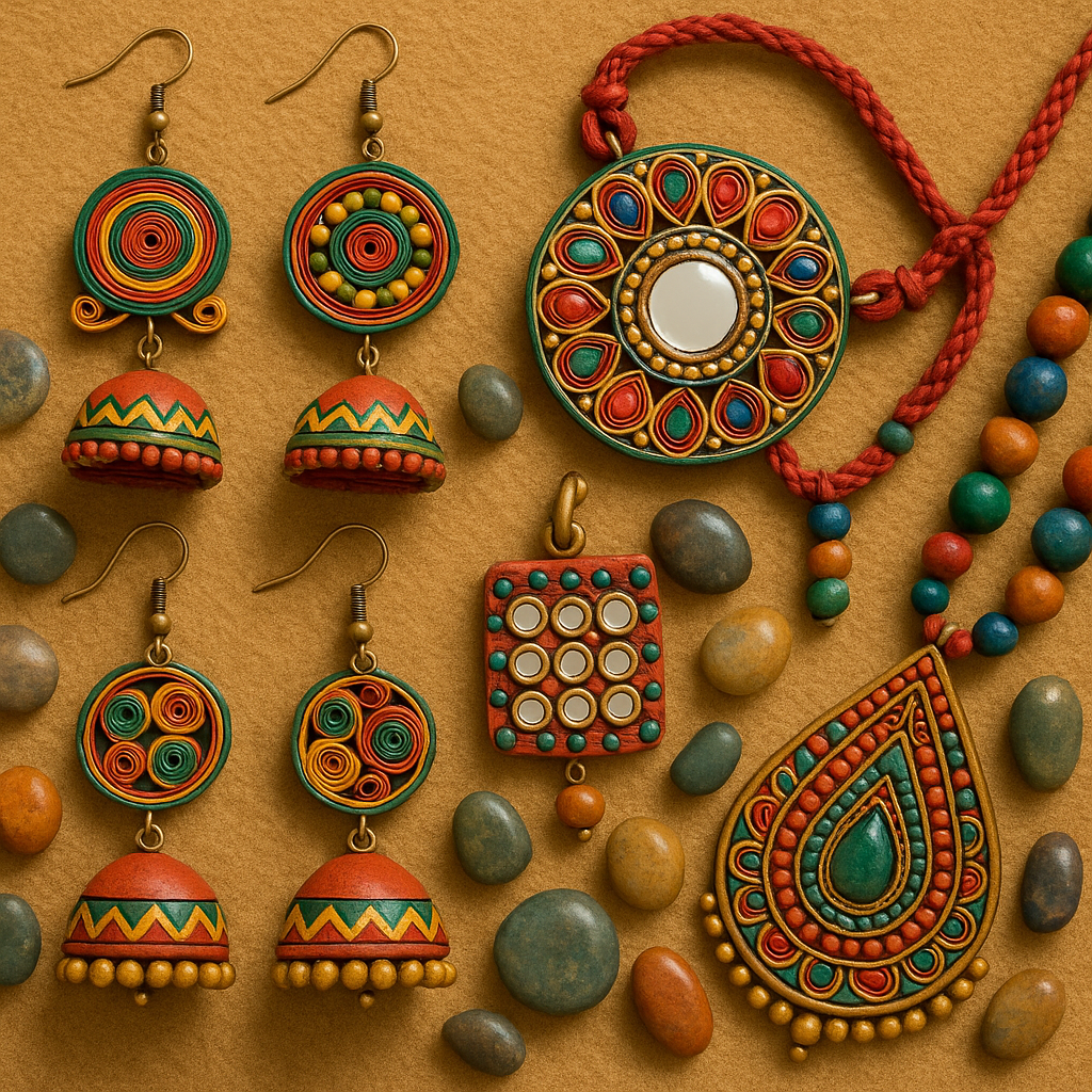 We specialize in handcrafted jewellery including glass beads jewellery, crochet jewellery, Kutch mirror work jewellery, alloy necklaces, thread jewellery, fabric jewellery, jute jewellery, hand-painted jewellery, and terracotta jewellery.